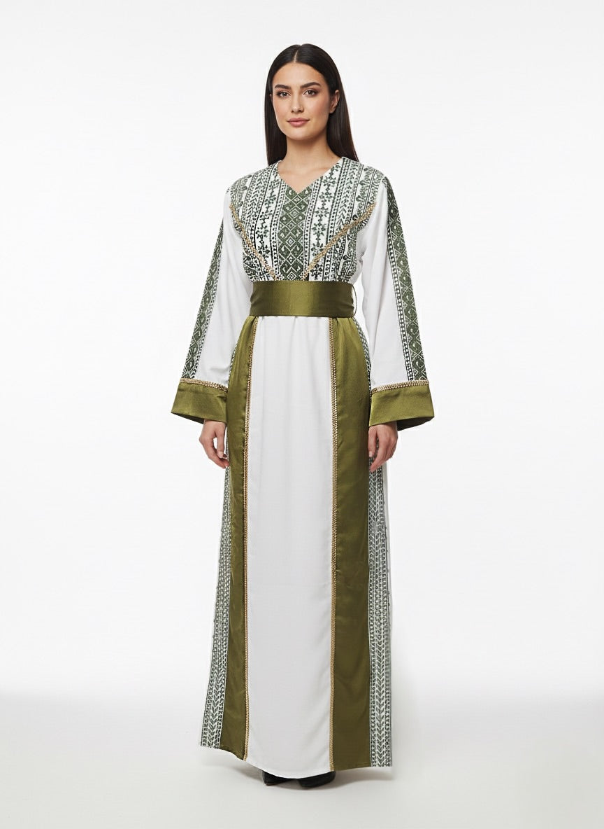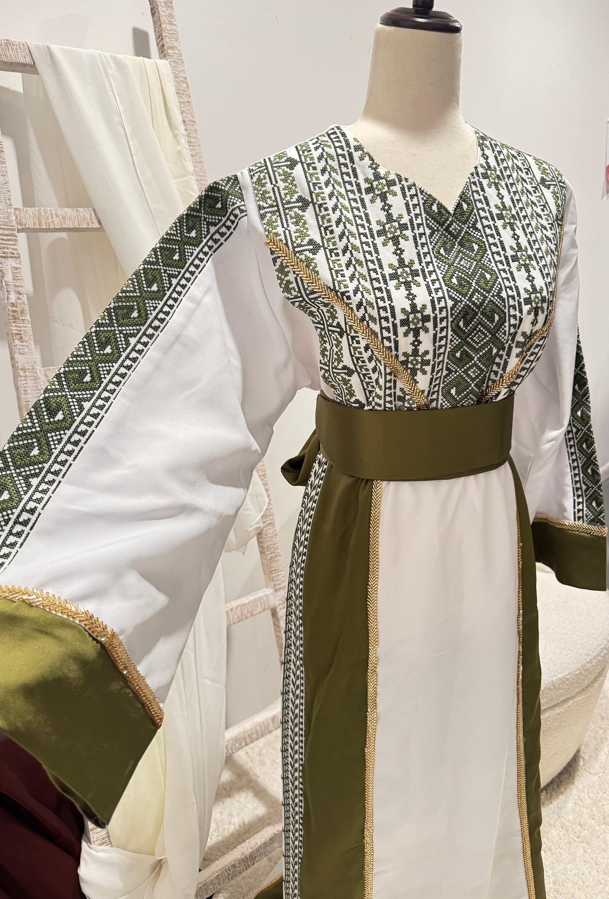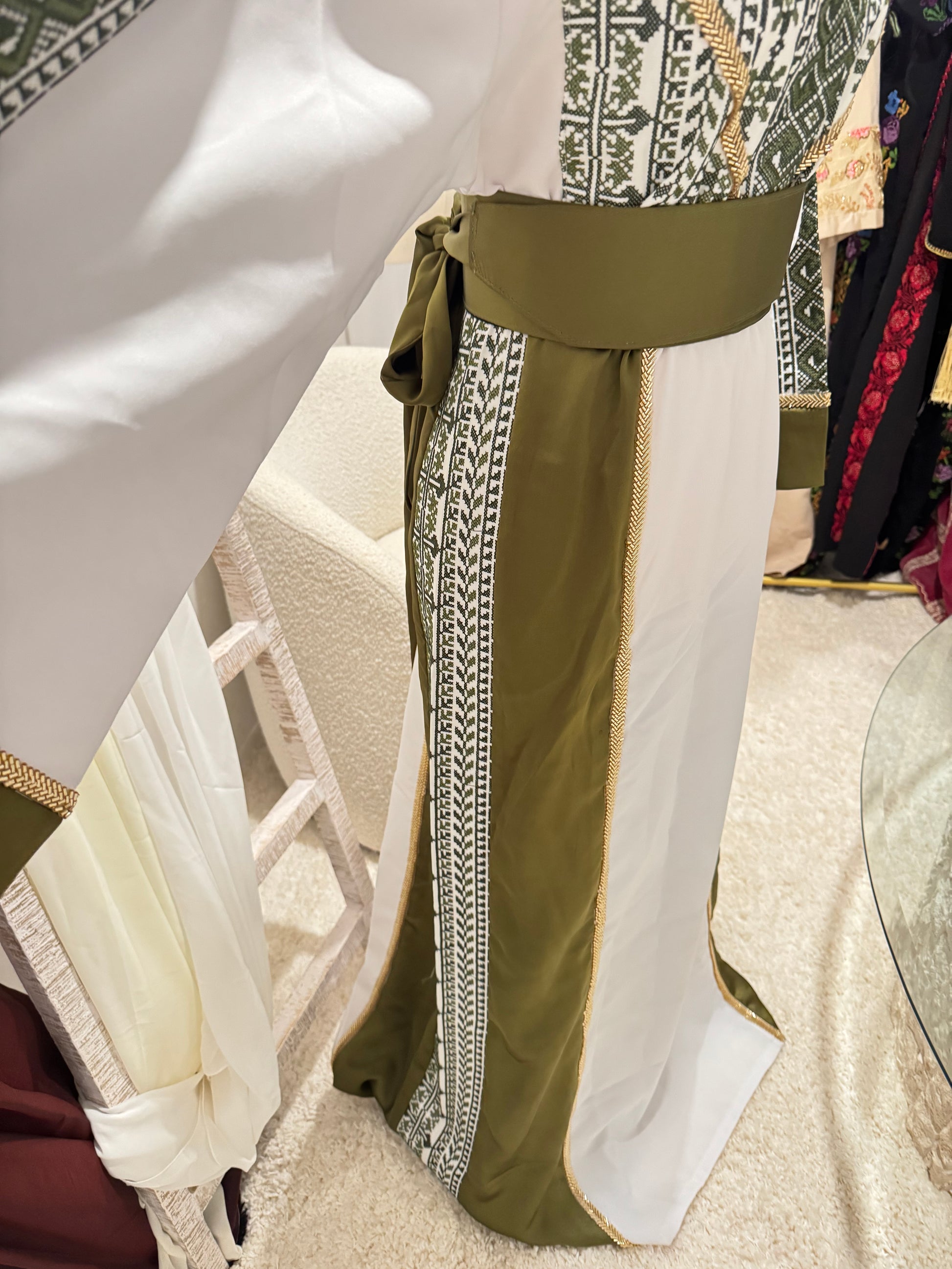 This is a one of one thobe designed in Palestine. Features a crepe material and satin accents. Maching made tatreez with gold beaded accents on sides and back of thobe as well. Includes belt