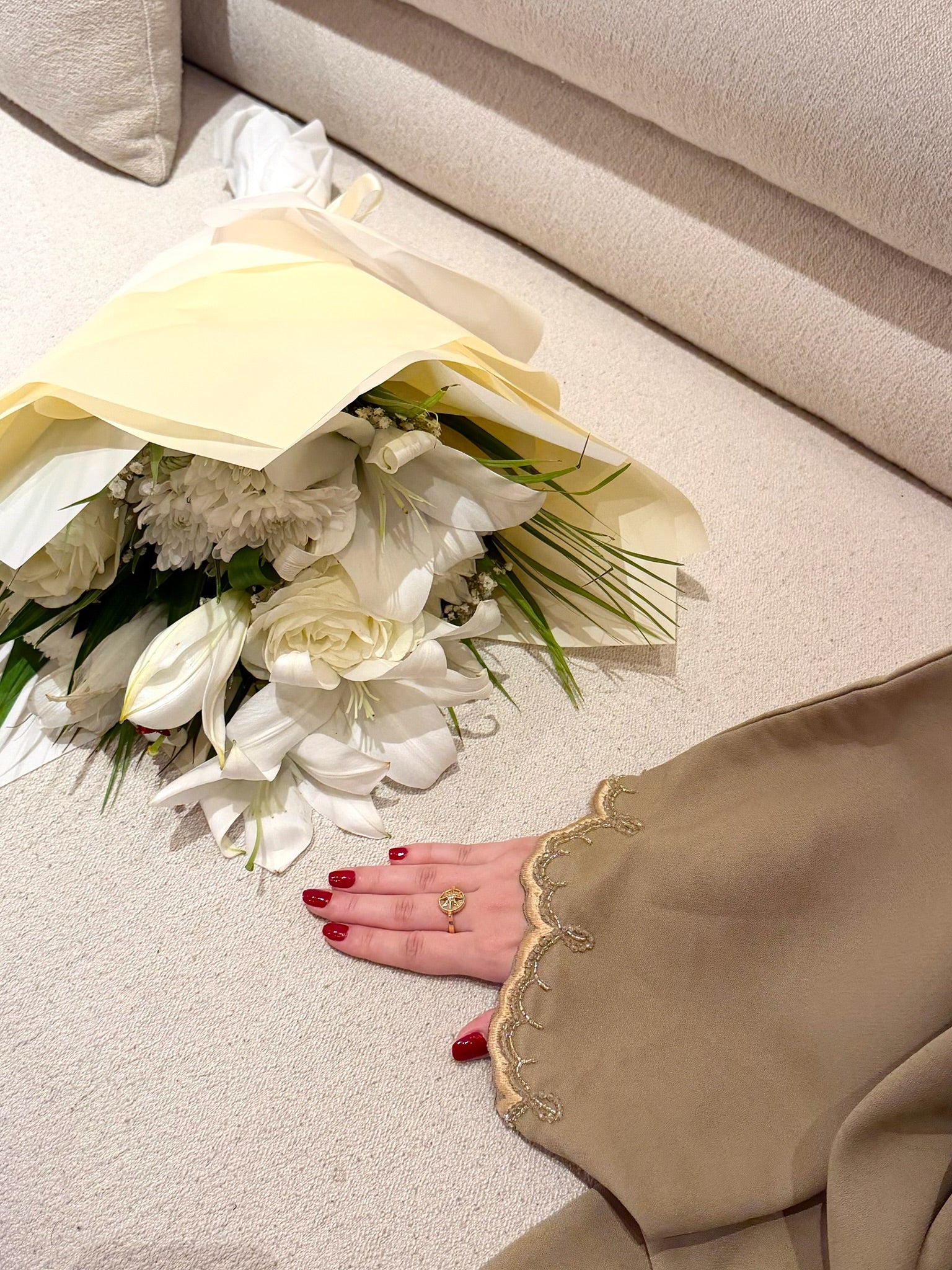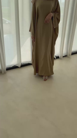 Pre order This kaftan is made out of a beautiful taupe crepe fabric.The neckline opening and the sleeve cuffs are exquisitely handmade gold embroidery and crystal rounded edge design. The kaftan includes a belt on the inside that creates a more fitted illusion of the waist. Includes a matching chiffon hijab that features the signature gold rounded edge. Ensuring a complete and perfectly coordinated look.