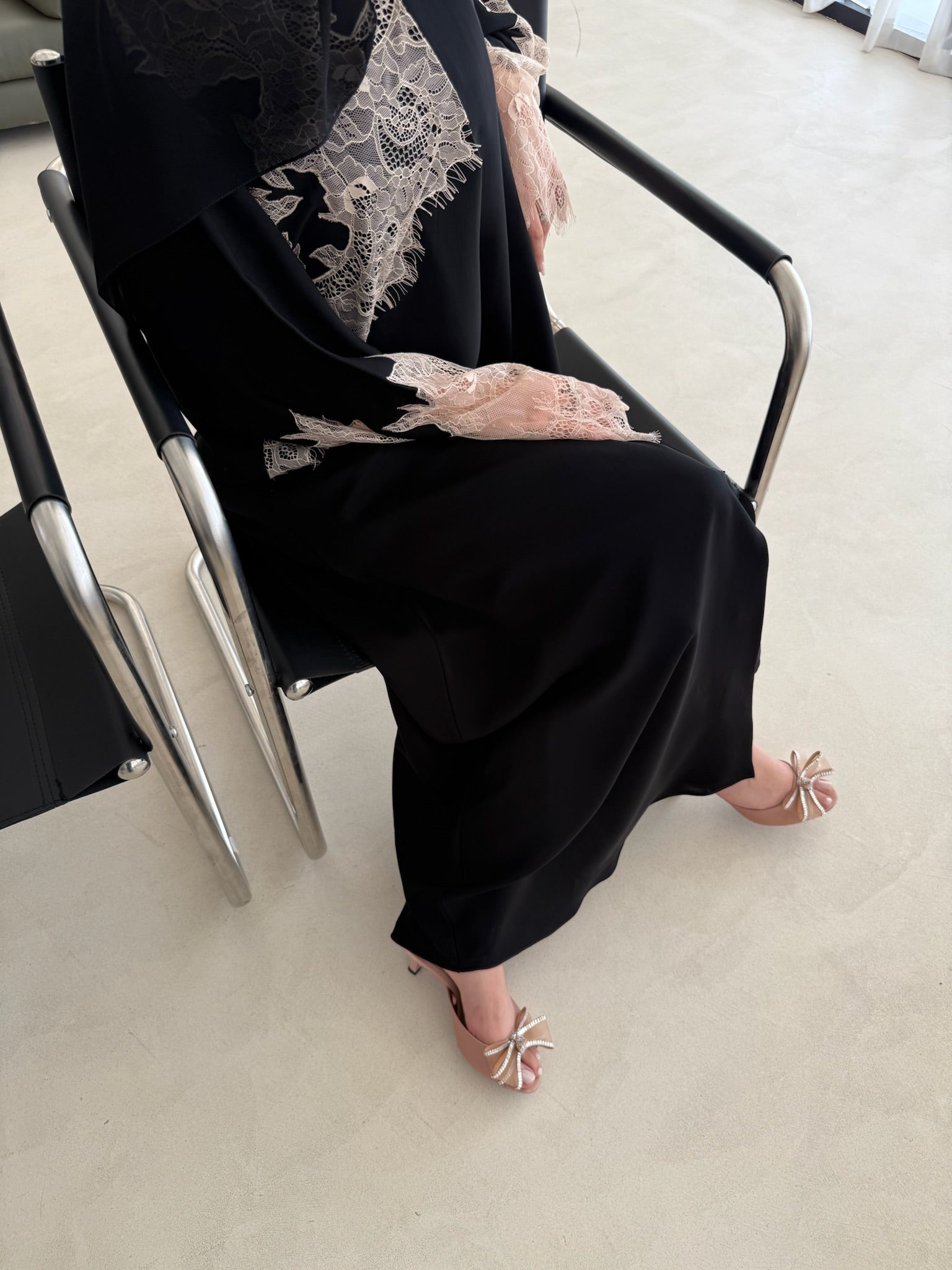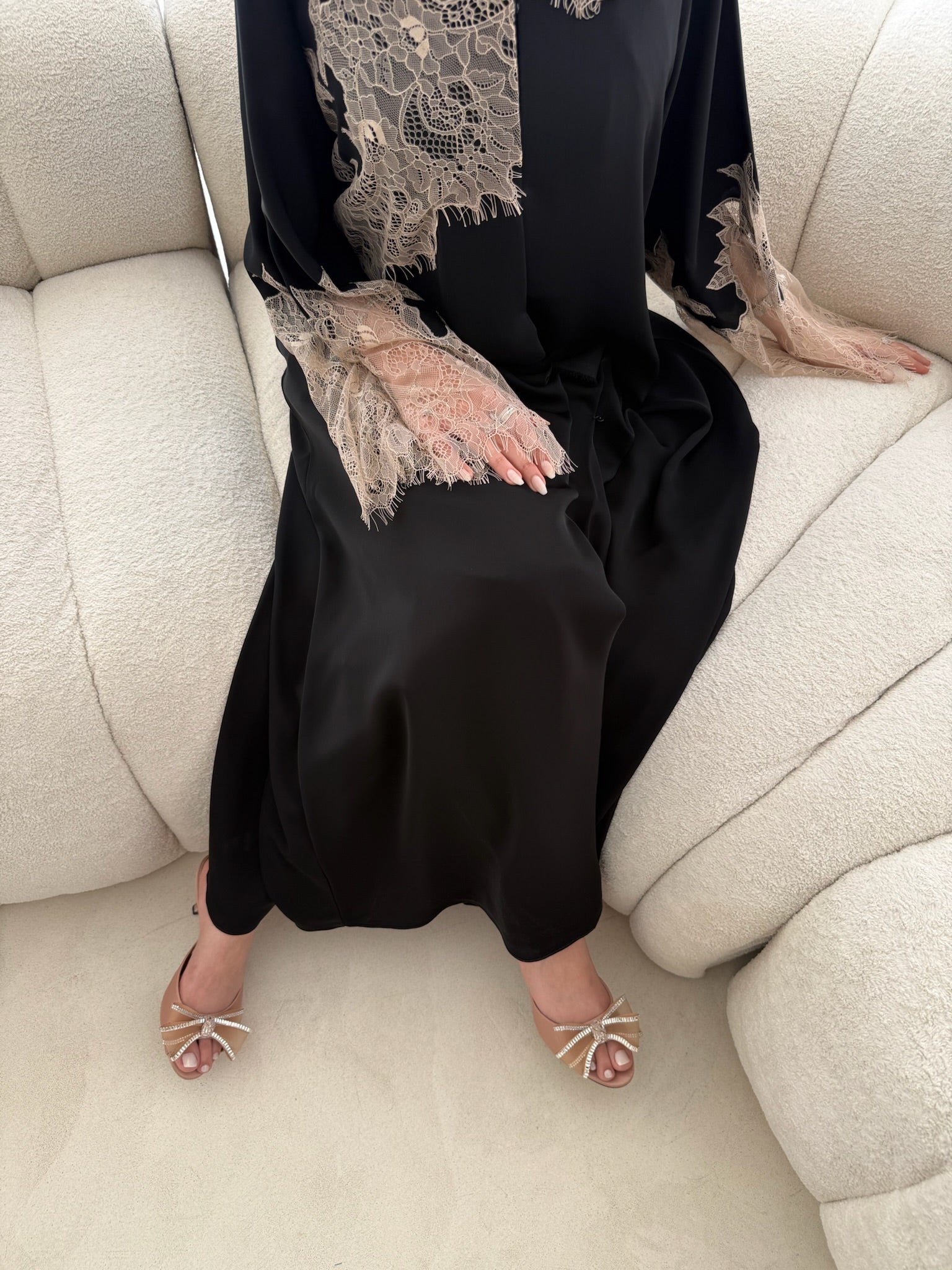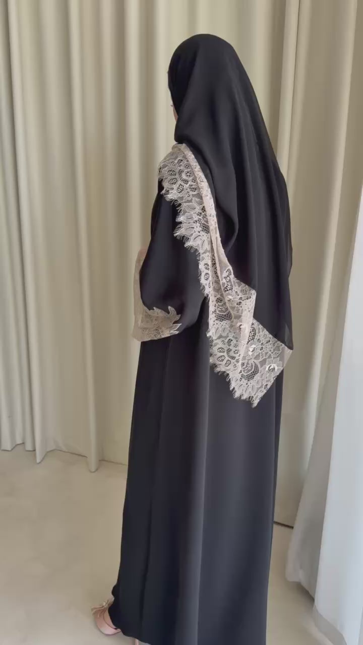 Pre order This black abaya features an intricate cream dyed French lace on each sleeve. The lace detail is also patched on one side of the front opening, Creating a unique focal point and a subtle asymmetrical design. Included is a beautiful matching black chiffon hijab with the luxurious french lace detail on the long side of the hijab. Making this the two piece set you need in your abaya wardrobe! The abaya does include a few buttons for the front opening.
