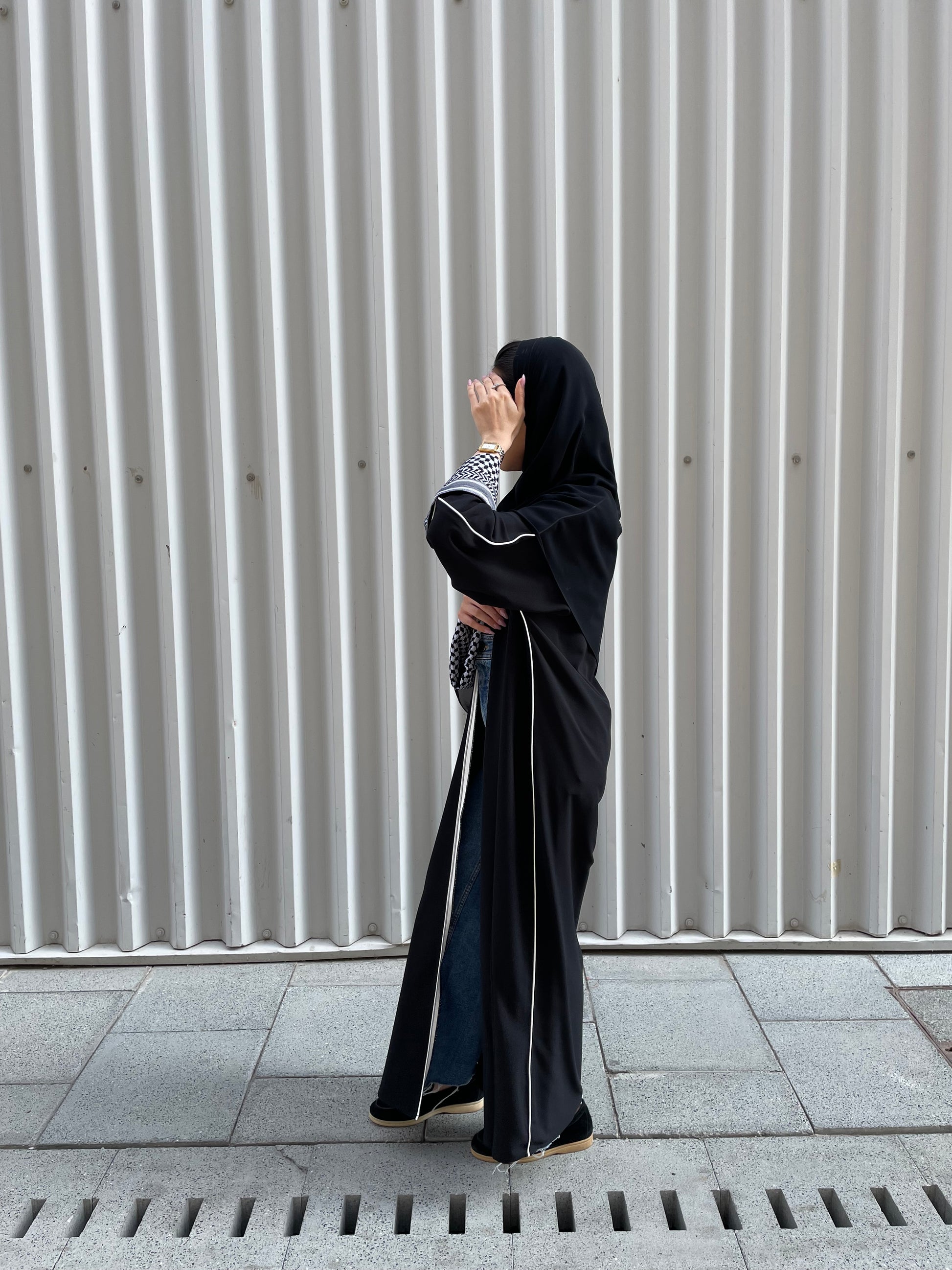 black abaya with fold over kuffiyeh inspired sleeve. White stripe detail. Black open abaya.