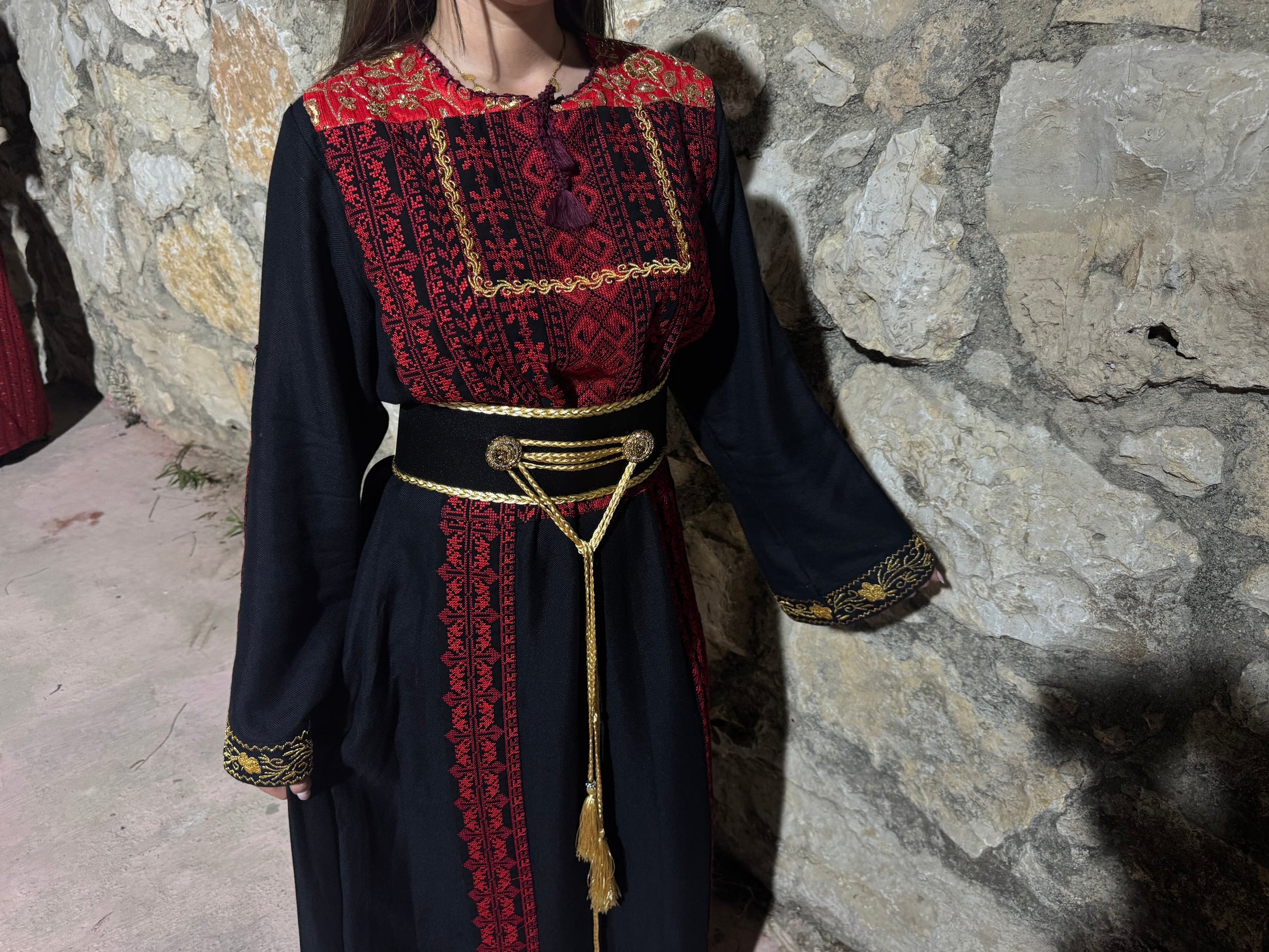 Handmade thobe. Tatreez panels are machine made with gold embroidery reworked over chest piece and sleeve. This thobe is handmade with different vintage fabrics stitched together. Shoulder patches are a gold floral embroidery. Tatreez continues in back below waist to flore. Two panels on each side. Leather belt is handmade with gold coin details. Can be purchased with or without