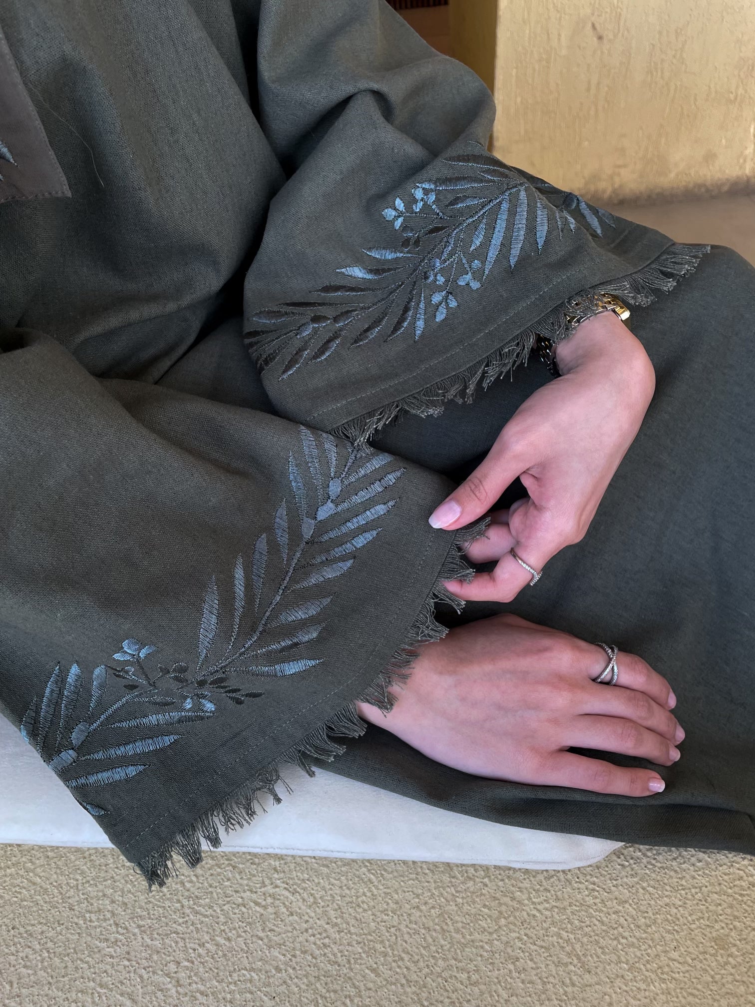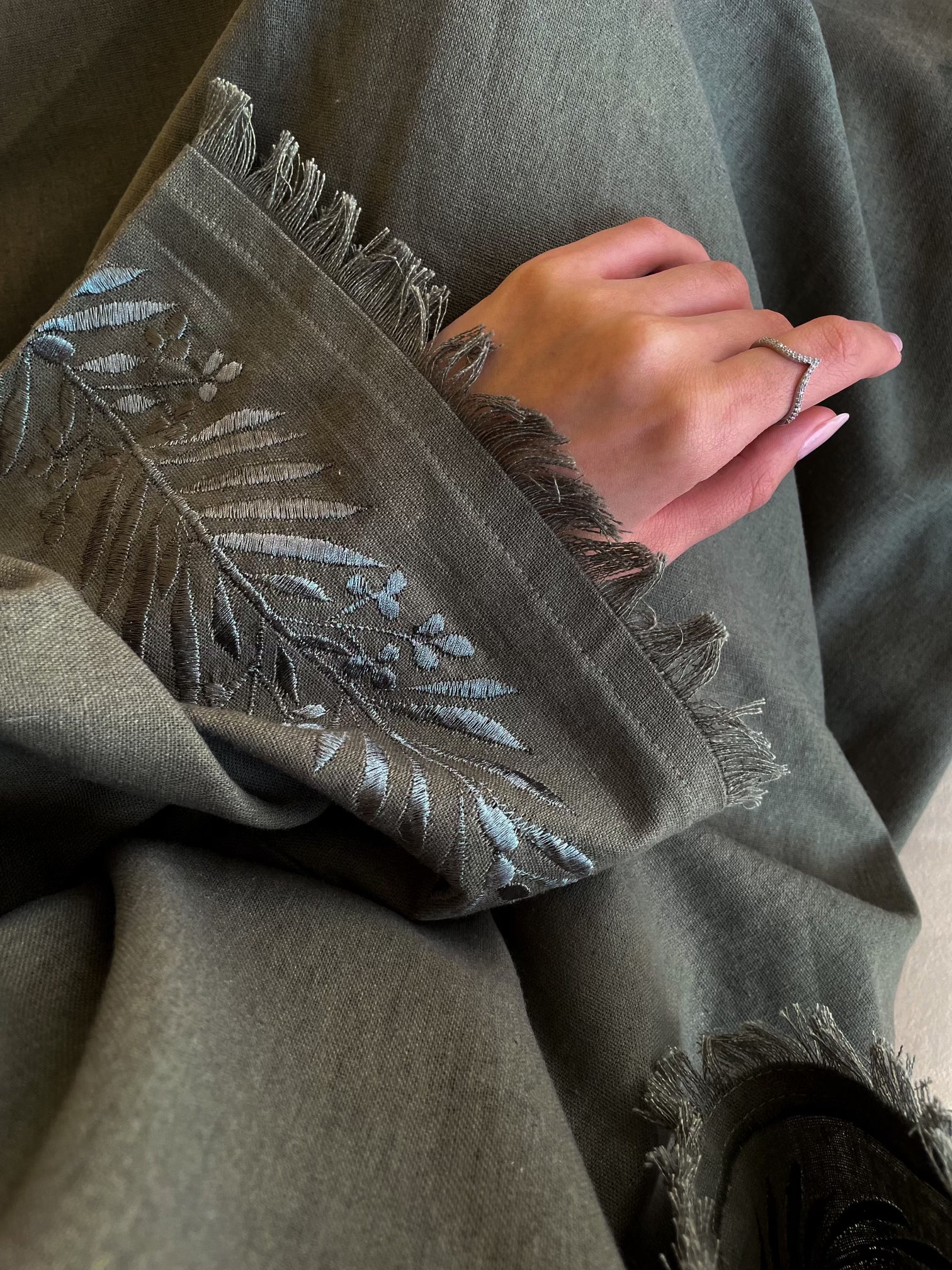 This beautiful linen olive branch closed abaya dress is its tribute to the Palestinian roots and the value of olive trees in our country. The olive branch design is handmade on the cuff of each sleeve of the closed abaya including A fringe sleeve detail. The top of the closed abaya has a collar with small opening which can be worn as is or covered by your hijab. This is not meant to be a fitted dress. It is meant to be a loose fit.